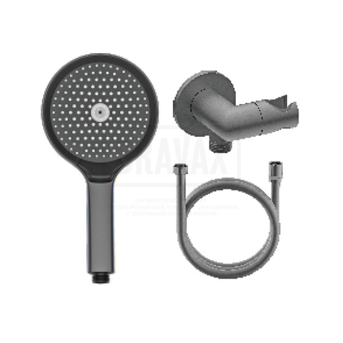 Дополнительная информацияДержатель для душевой лейки с подключением шланга; Душевая лейка - 3 режима (пластик/силикон); Душевой шланг силиконовый - 150 см.