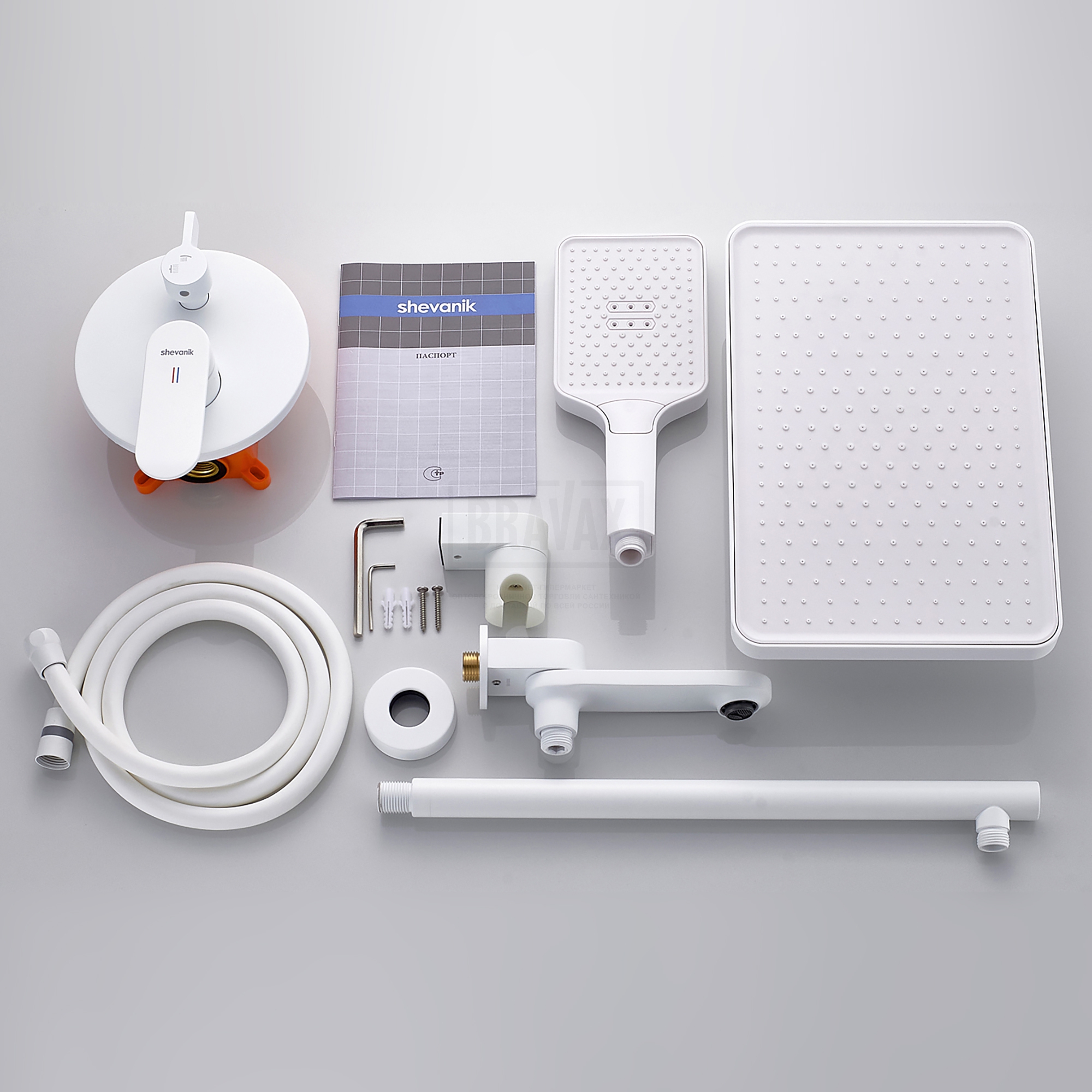 Состав комплектас душевой лейкой, с шлангом для душа, с кронштейном, верхний душ, внутренняя часть смесителя, излив, с настенным держателем, смеситель, шланговое подключение