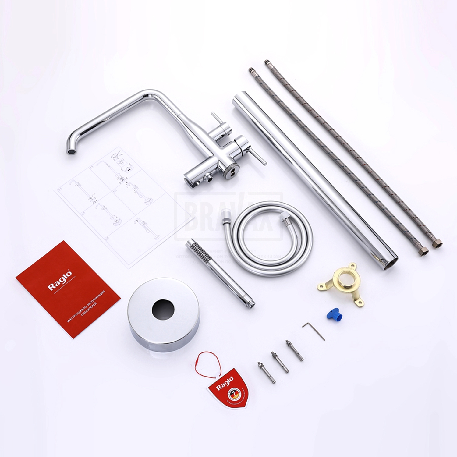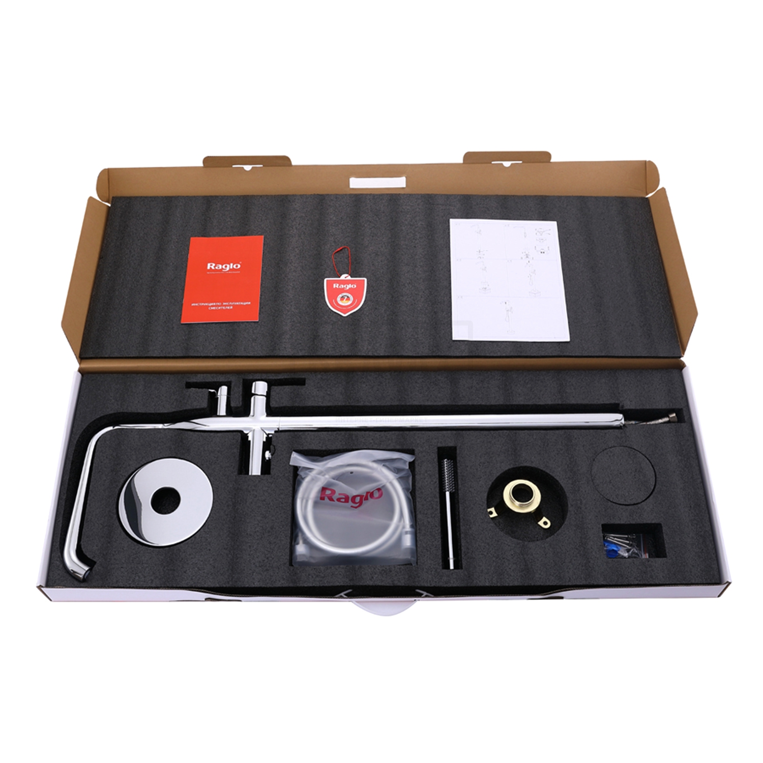 В комплектеГибкая подводка 1/2, душевой шланг 150 см, душевая лейка, держатель лейки, комплект отражателей, комплект эксцентриков
