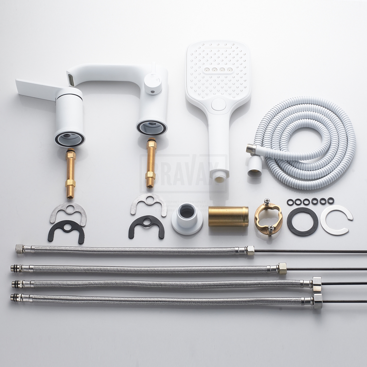 В комплектеГибкая подводка 1/2, душевой шланг 150 см, душевая лейка, держатель лейки