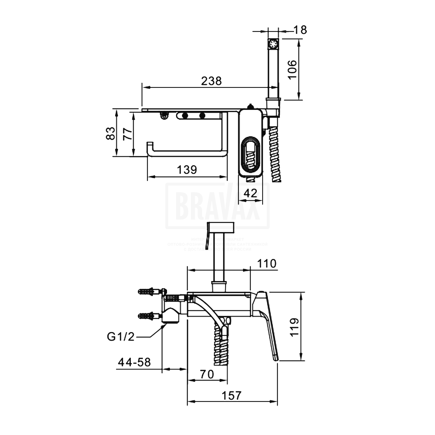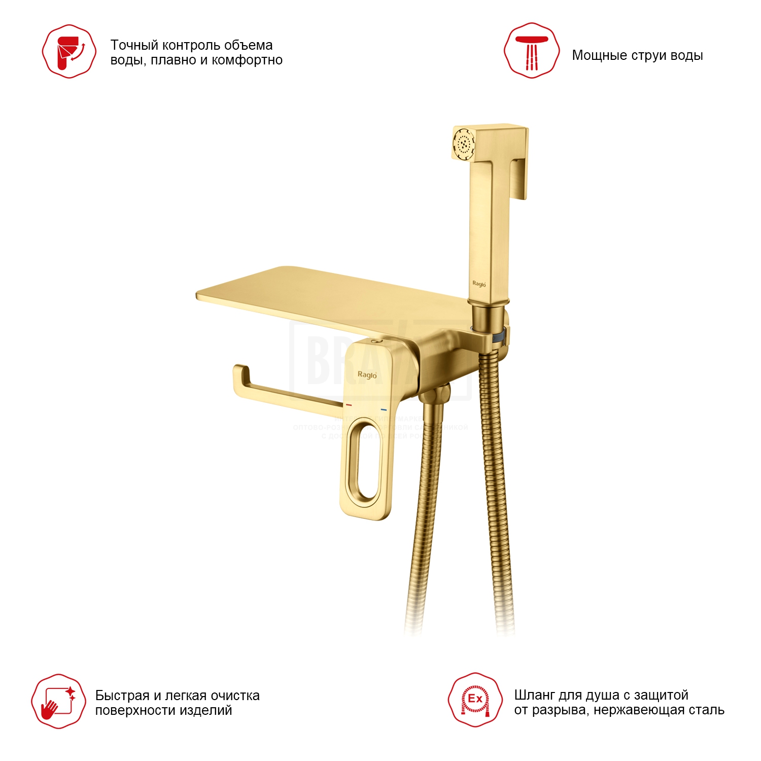 В комплектес гигиеническим душем, держатель лейки, Душевой шланг 120 см, комплект эксцентриков, комплект отражателей