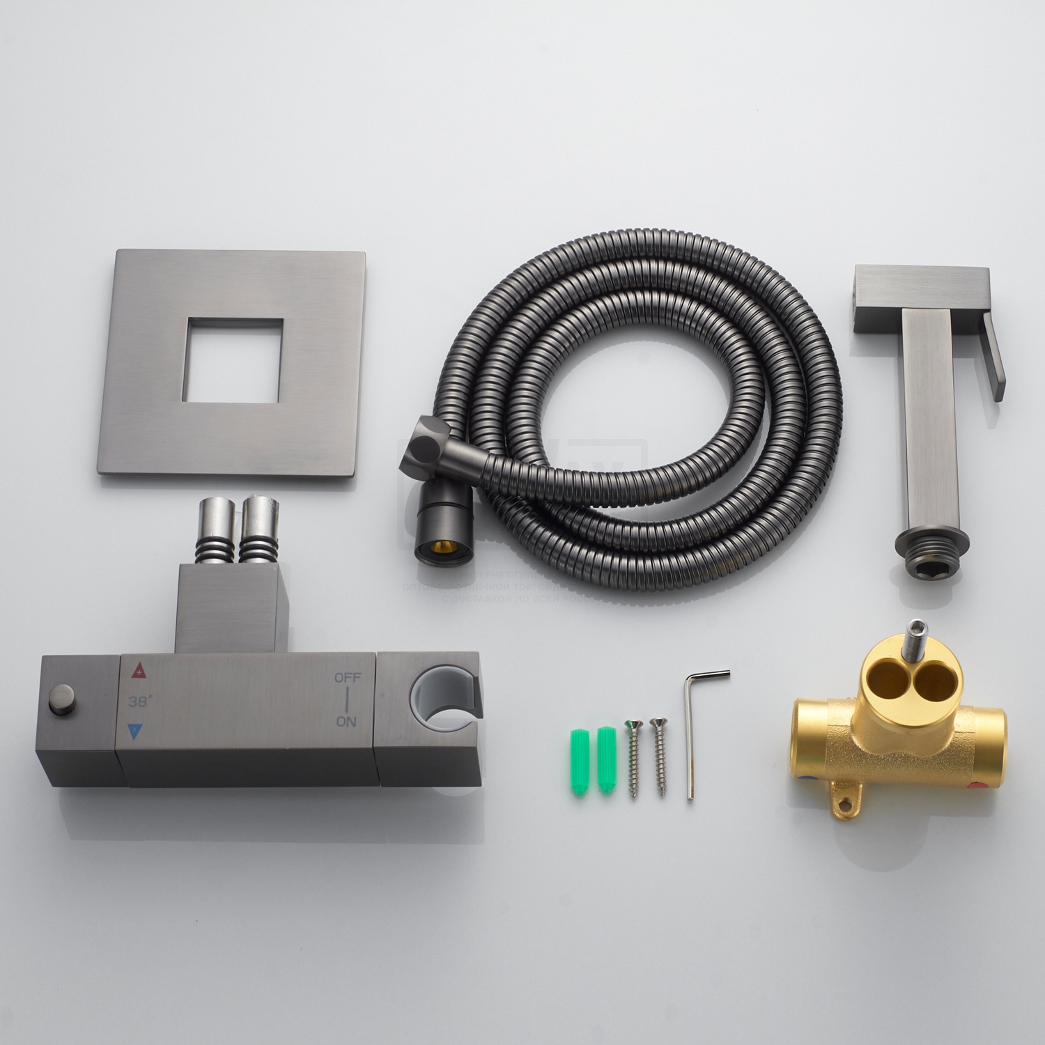 В комплектеДушевой шланг 120 см, с гигиеническим душем, держатель лейки, комплект отражателей, комплект эксцентриков